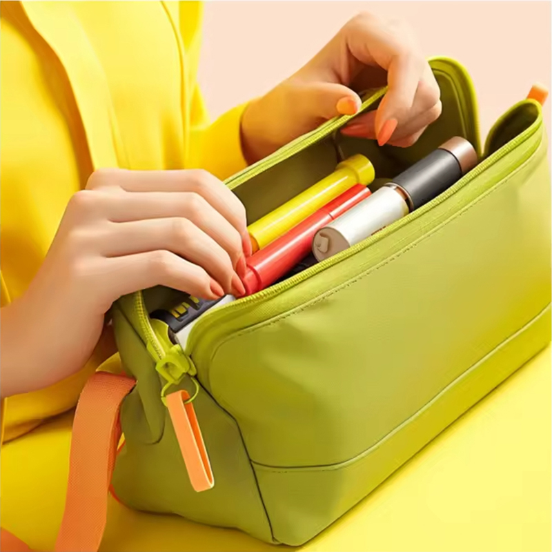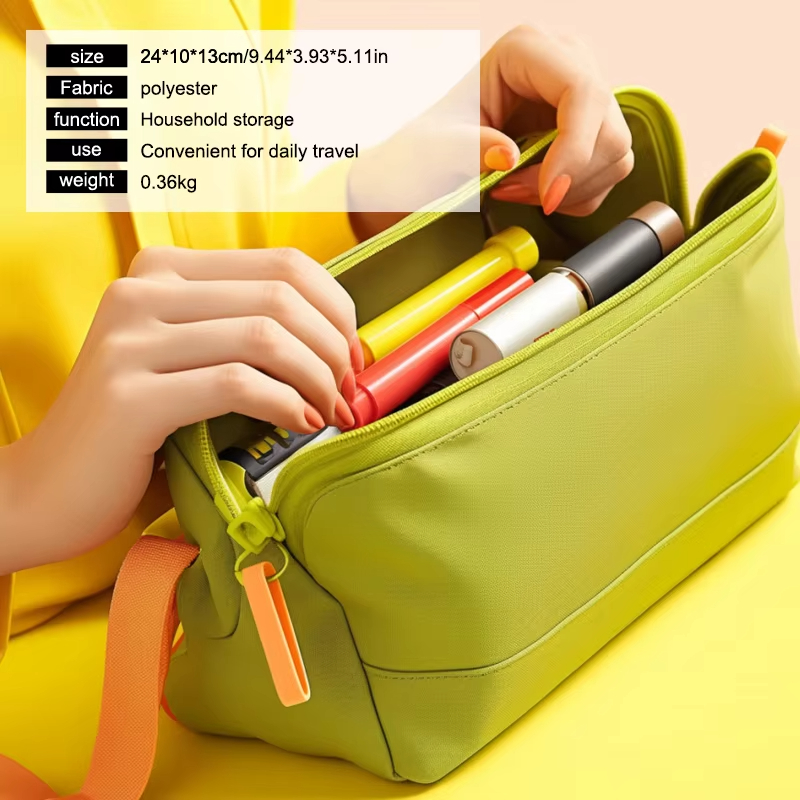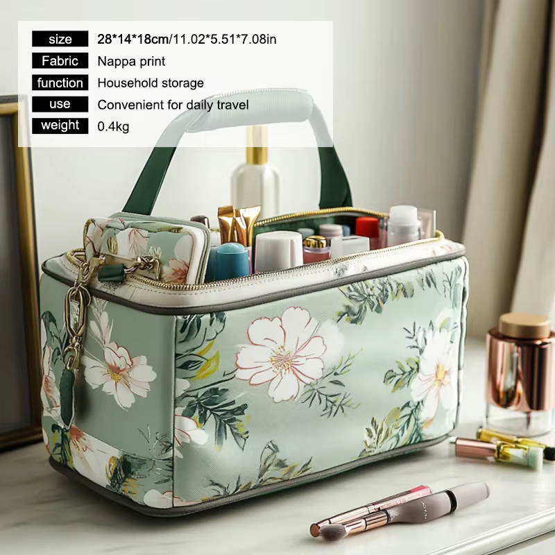 La bolsa de cosméticos portátil está diseñada teniendo en cuenta la comodidad. Su estructura liviana y compacta lo hace fácil de transportar, ya sea que vayas al gimnasio, en una escapada de fin de semana o simplemente necesites una solución de almacenamiento confiable en casa. Este bolso cabe sin esfuerzo en su equipaje o bolso, lo que garantiza que pueda llevar todos sus artículos esenciales de belleza sin el volumen.
