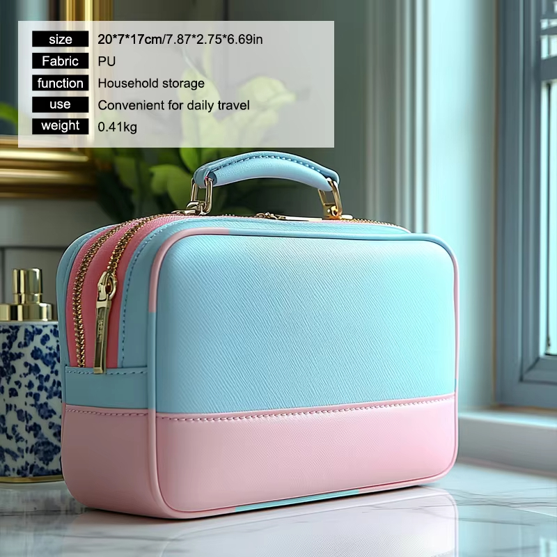 Presentamos nuestra bolsa de cosméticos portátil e impermeable — su compañero ideal para guardar cosméticos, artículos de tocador y artículos personales. Fabricado con cuero PU impermeable de primera calidad, este bolso ofrece durabilidad y estilo, lo que lo convierte en una opción ideal para uso diario o viajes.