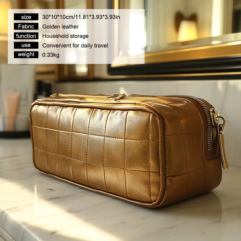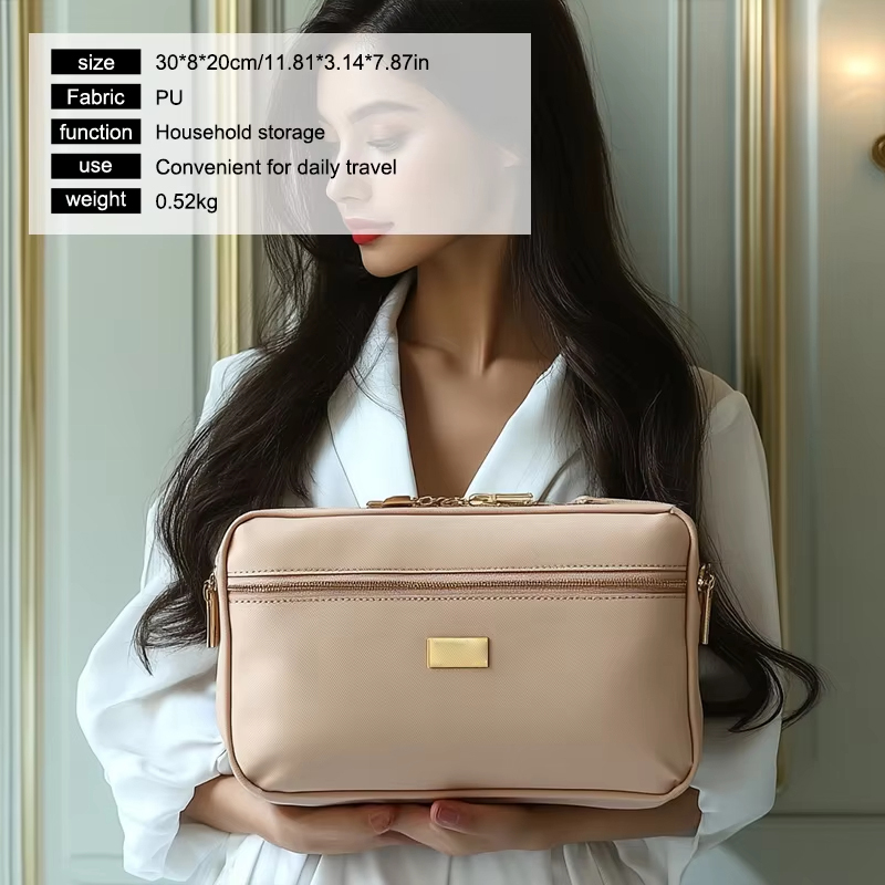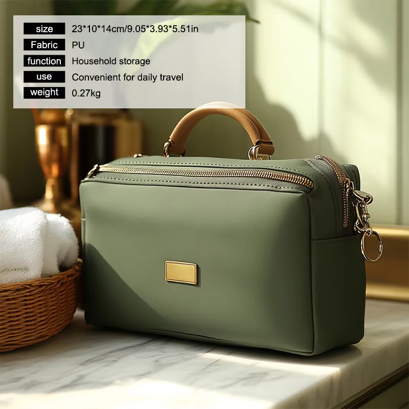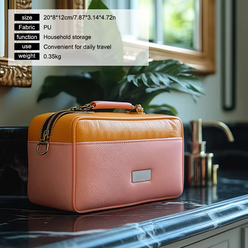 Fabricada en cuero PU, la bolsa cosmética portátil de almacenamiento de cuero cuenta con un aspecto sofisticado y atemporal. La textura suave del cuero PU no solo agrega un toque de lujo sino que también garantiza que el bolso sea resistente al desgaste. El material duradero le permite soportar el uso diario, lo que lo convierte en un compañero confiable tanto para viajes como para el almacenamiento diario.