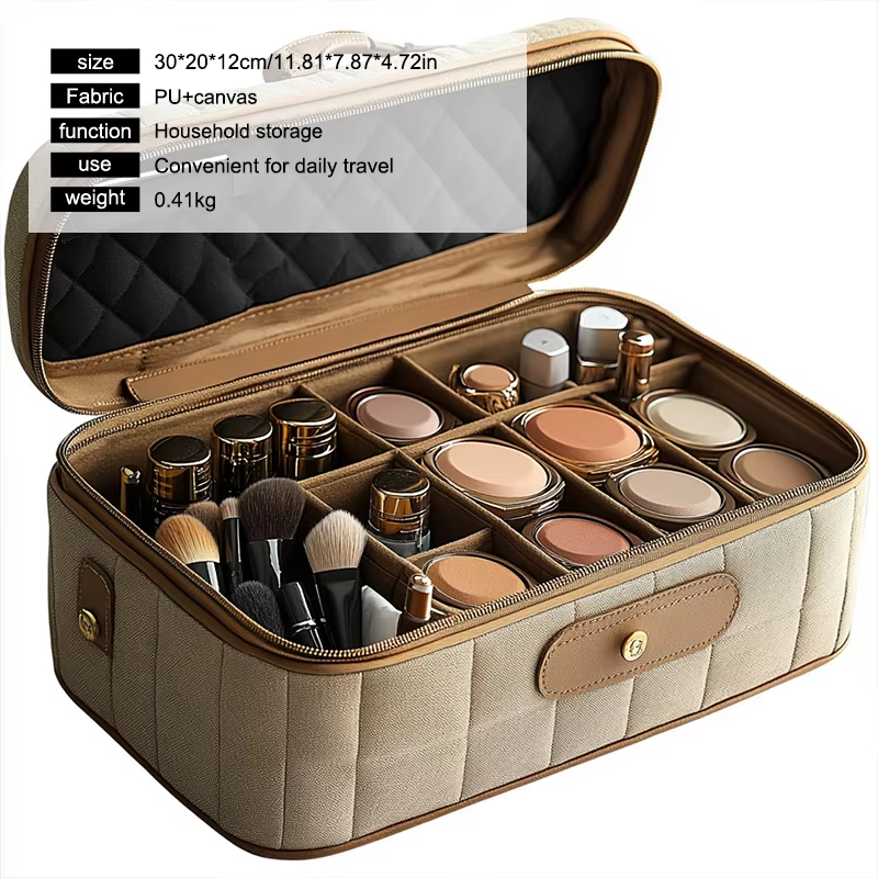 La bolsa de cosméticos portátil de cuero es imprescindible para cualquiera que quiera mantener sus cosméticos organizados y de fácil acceso. Su construcción duradera de cuero PU, su diseño compacto y su amplia capacidad de almacenamiento lo convierten en una opción práctica tanto para viajes como para uso doméstico.
