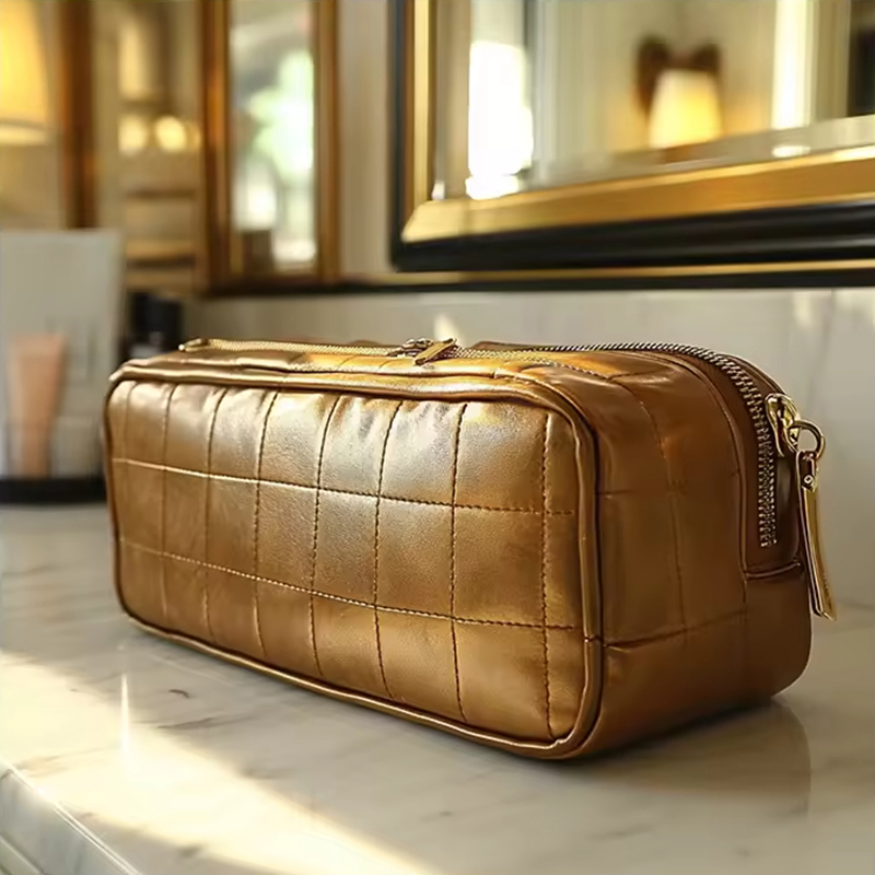 Además de ser un gran compañero de viaje, la bolsa cosmética portátil de cuero también es ideal para organizar tus productos de belleza en casa. Su elegante diseño le permite combinarse perfectamente con cualquier decoración, mientras que su construcción robusta garantiza que sus artículos permanezcan seguros y protegidos.
