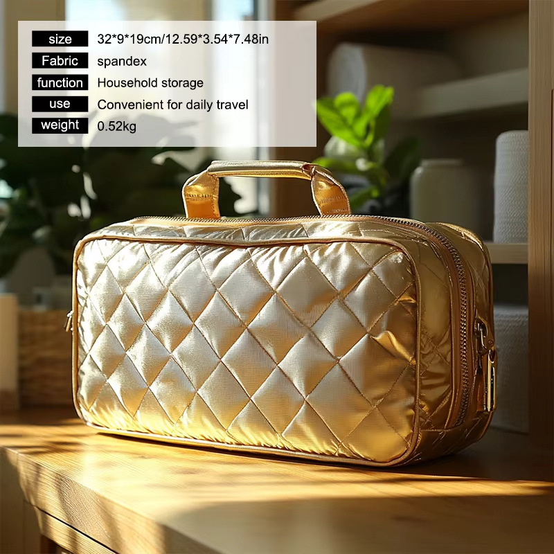 El bolso cosmético organizador de viaje de cuero PU acolchado es una solución versátil y elegante para mantener organizados sus cosméticos, artículos de tocador y otros elementos esenciales. Con su duradera tela de spandex y su lujoso exterior acolchado de cuero PU, este bolso es práctico y moderno.