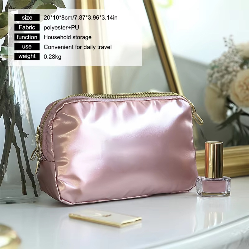 La bolsa de cosméticos personalizada ODM OEM de fábrica cumple más que un simple propósito cosmético. También puede funcionar como bolsa de artículos de tocador, sosteniendo su cepillo de dientes, pasta de dientes, crema de afeitar y otros artículos esenciales para el cuidado personal. Su versatilidad lo convierte en una gran opción tanto para uso doméstico como para viajes. Ya sea que estés organizando tu maquillaje en casa o empacando artículos de tocador para un viaje, esta bolsa satisface todas tus necesidades.